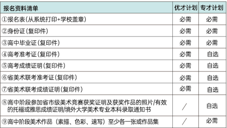 报名资料准备: 考生报名时准备好近期免冠2寸登记照(电子文档),并根据自身情况按下列表格清单提前准备好报名资料的扫描件(电子文档)。(专才计划和优才计划只能选报一项) 报名时间:一般高考后6月下旬–7月上旬